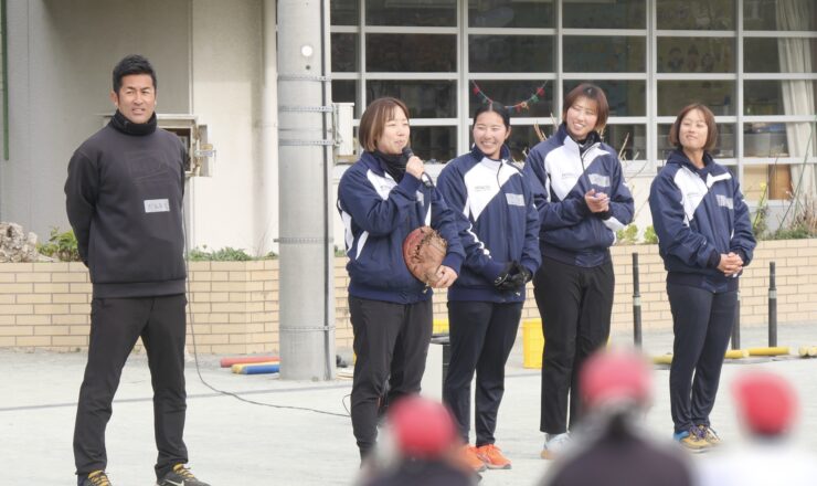 ◇末広小・本町小 日立サンディーバの選手(奥野心(投手)、小島あみ(捕手)、堀口佳乃(内野手)、渡部翠里(外野手/投手)、村山修次(監督))によるソ...
